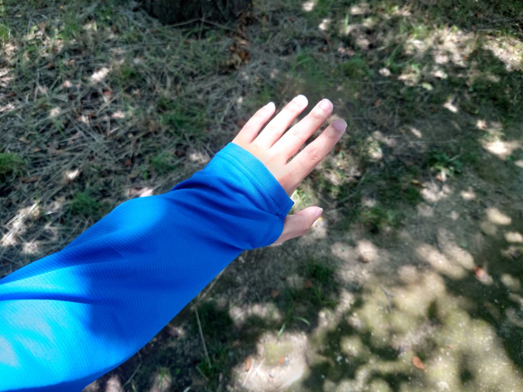 手首部分に親指を挿入できる穴がありており、手の甲を日の光から守ることが可能。