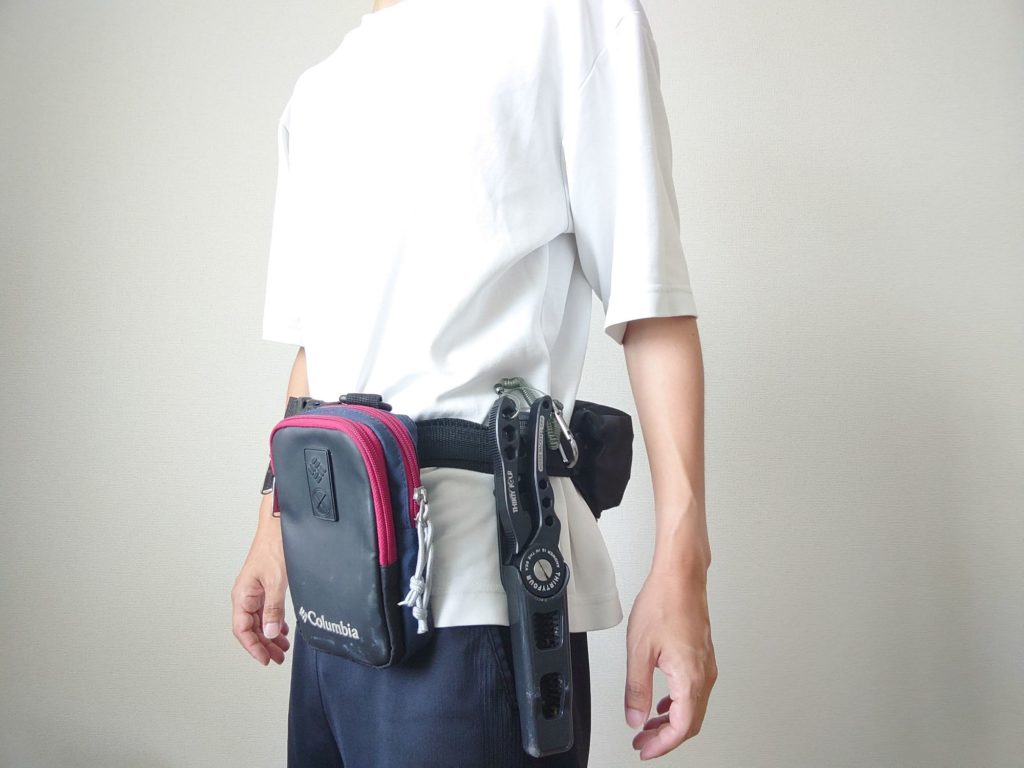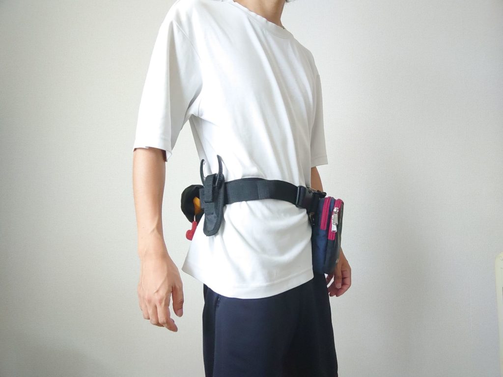 ウエスト部に固定し、即座に取り出せるようにしています。