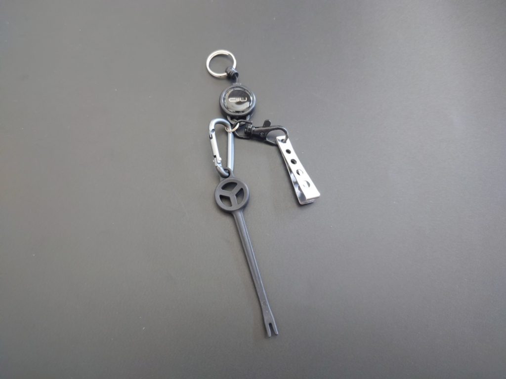 ピンオンリールにラインカッターとフックリムーバーをぶら下げ、バッグに収納しています。